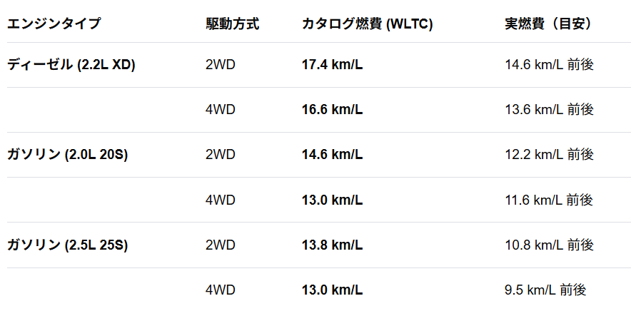 「SUVのガソリン車は燃費が悪い」と思われがちですが、KF型は健闘しています。